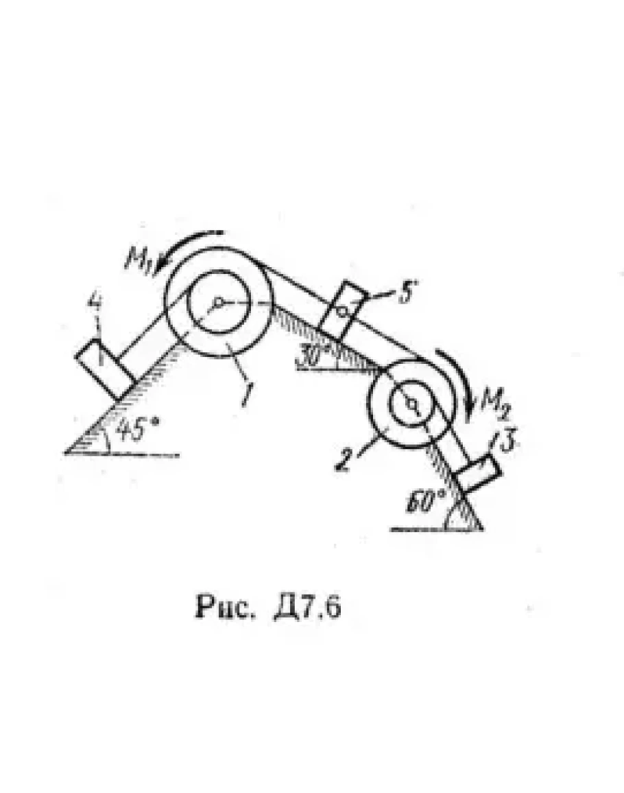 Механическая система состоит из шкивов 1 и 2, обмотанных нитями, и грузов 3—5, прикрепленных к этим нитям (рис. Д7.0 — Д7.9, табл. Д7). Система движется в вертикальной плоскости под действием сил тяжести и двух пар сил с моментом М1, приложенной к шкиву 1, и пары с моментом М2, приложенной к шкиву 2. Радиусы ступеней шкива 1 равны: R1 = 0,3 м, r1 — 0,15 м, а шкива 2 — R2 = 0,2 м, r2 = 0,1 м; их радиусы инерции относительно осей вращения равны соответственно ρ1 = 0,2 м и ρ2 = 0,1 м.