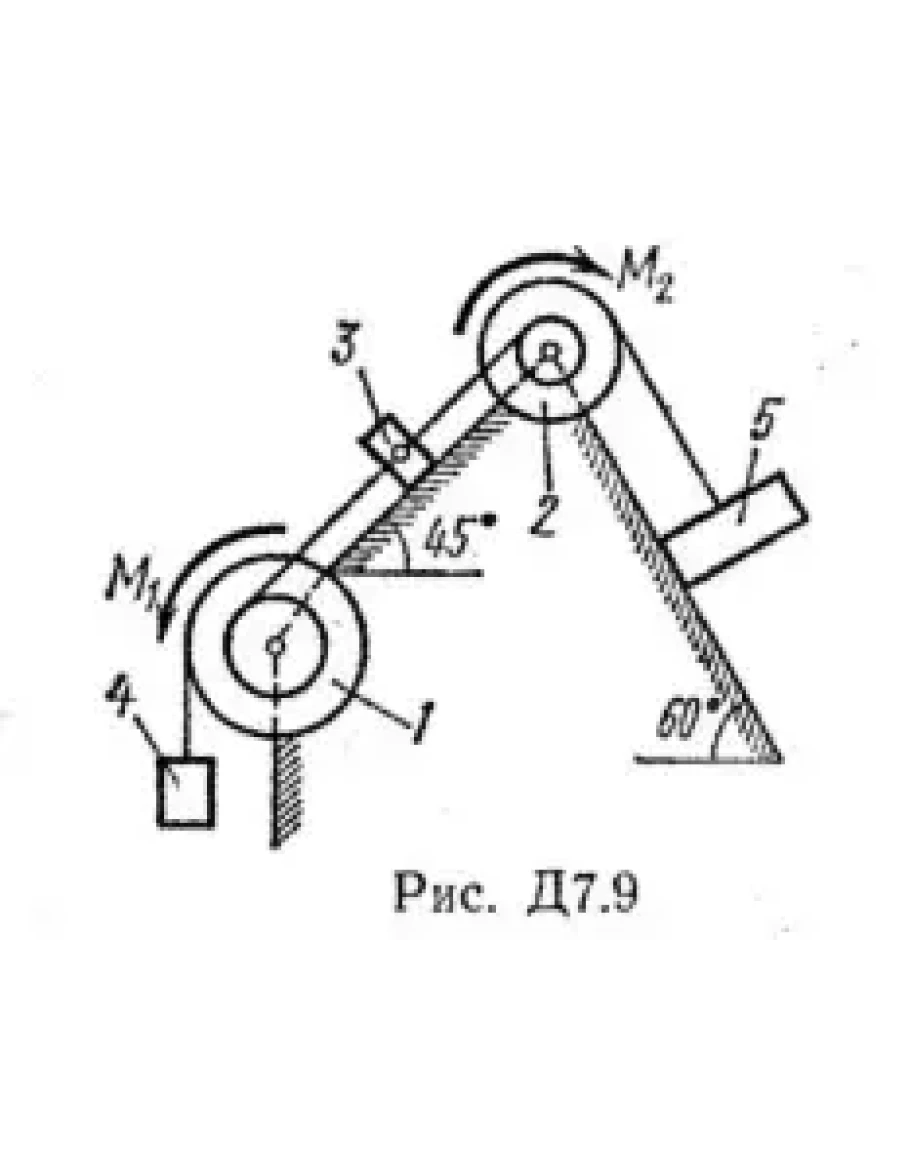 Механическая система состоит из шкивов 1 и 2, обмотанных нитями, и грузов 3—5, прикрепленных к этим нитям (рис. Д7.0 — Д7.9, табл. Д7). Система движется в вертикальной плоскости под действием сил тяжести и двух пар сил с моментом М1, приложенной к шкиву 1, и пары с моментом М2, приложенной к шкиву 2. Радиусы ступеней шкива 1 равны: R1 = 0,3 м, r1 — 0,15 м, а шкива 2 — R2 = 0,2 м, r2 = 0,1 м; их радиусы инерции относительно осей вращения равны соответственно ρ1 = 0,2 м и ρ2 = 0,1 м.