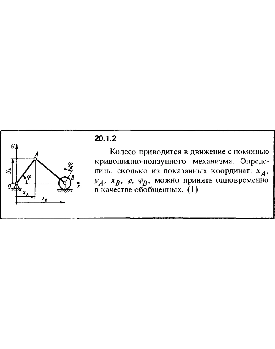 20.1.2. Колесо приводится в движение с помощью кривошипно-ползунного механизма. Определить, сколько из показанных координат: хА, yА, xB, φ, φB, можно принять одновременно в качестве обобщенных.