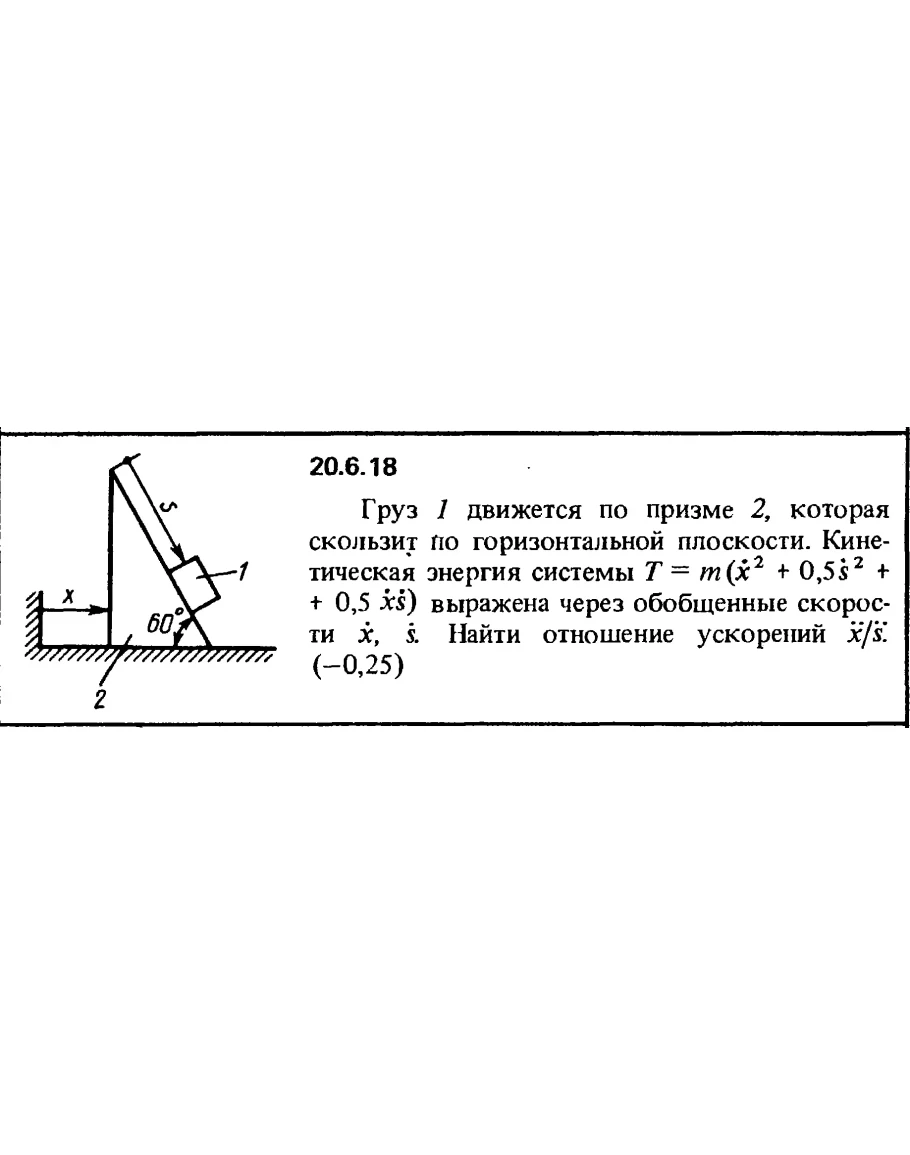 20.6.18. Груз 1 движется по призме 2, которая скользит по горизонтальной плоскости. Кинетическая энергия системы Т = m(x2 + 0,5s2 + 0,5 xs) выражена через обобщенные скорости х, s. Найти отношение ускорений x/s.