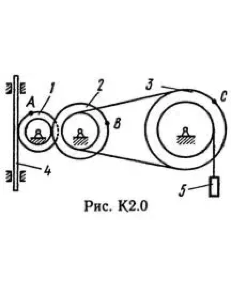 Механизм состоит из ступенчатых колес 1—3, находящихся в зацеплении или связанных ременной передачей, зубчатой рейки 4 и груза 5, привязанного к концу нити, намотанной на одно из колес (рис. К2.0 — К2.9, табл. К2). Радиусы ступеней колес равны соответственно: у колеса 1 – r1 = 2 см, R1 = 4 см, у колеса 2 – r2 = 6 см, R2 = 8 см, у колеса 3 – r3 — 12 см, R3 = 16 см. На ободьях колес расположены точки A, В и С.