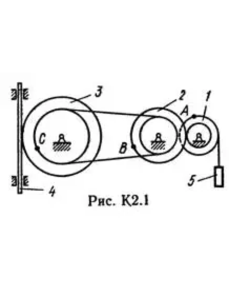 Механизм состоит из ступенчатых колес 1—3, находящихся в зацеплении или связанных ременной передачей, зубчатой рейки 4 и груза 5, привязанного к концу нити, намотанной на одно из колес (рис. К2.0 — К2.9, табл. К2). Радиусы ступеней колес равны соответственно: у колеса 1 – r1 = 2 см, R1 = 4 см, у колеса 2 – r2 = 6 см, R2 = 8 см, у колеса 3 – r3 — 12 см, R3 = 16 см. На ободьях колес расположены точки A, В и С.