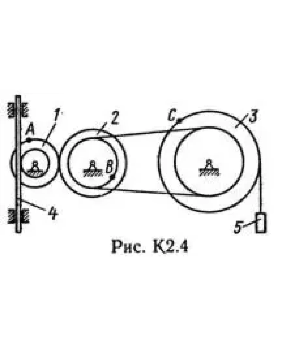 Механизм состоит из ступенчатых колес 1—3, находящихся в зацеплении или связанных ременной передачей, зубчатой рейки 4 и груза 5, привязанного к концу нити, намотанной на одно из колес (рис. К2.0 — К2.9, табл. К2). Радиусы ступеней колес равны соответственно: у колеса 1 – r1 = 2 см, R1 = 4 см, у колеса 2 – r2 = 6 см, R2 = 8 см, у колеса 3 – r3 — 12 см, R3 = 16 см. На ободьях колес расположены точки A, В и С.