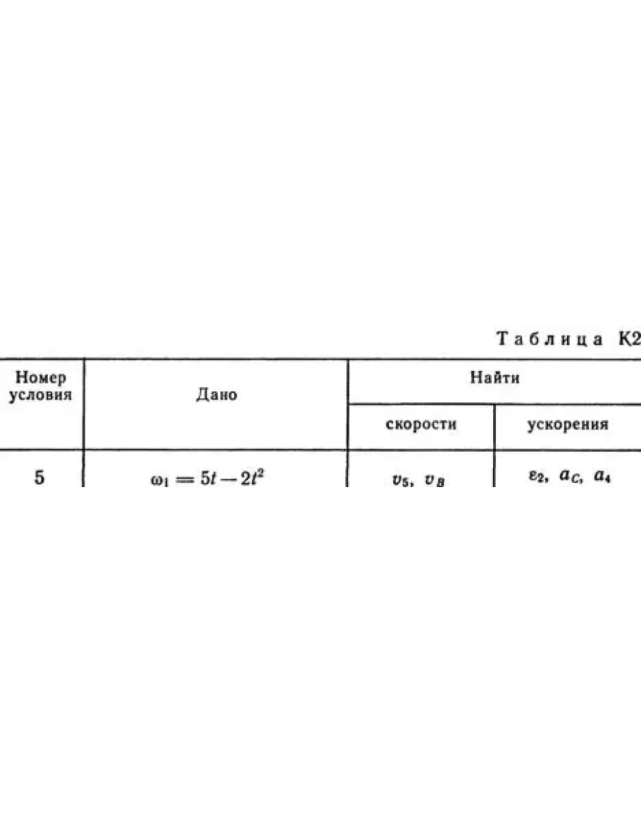 Определить в момент времени t1 = 2 с указанные в таблице в столбцах «Найти» скорости (v — линейные, ω — угловые) и ускорения (а — линейные, ε — угловые) соответствующих точек или тел (v5 — скорость груза 5 и т. д.).