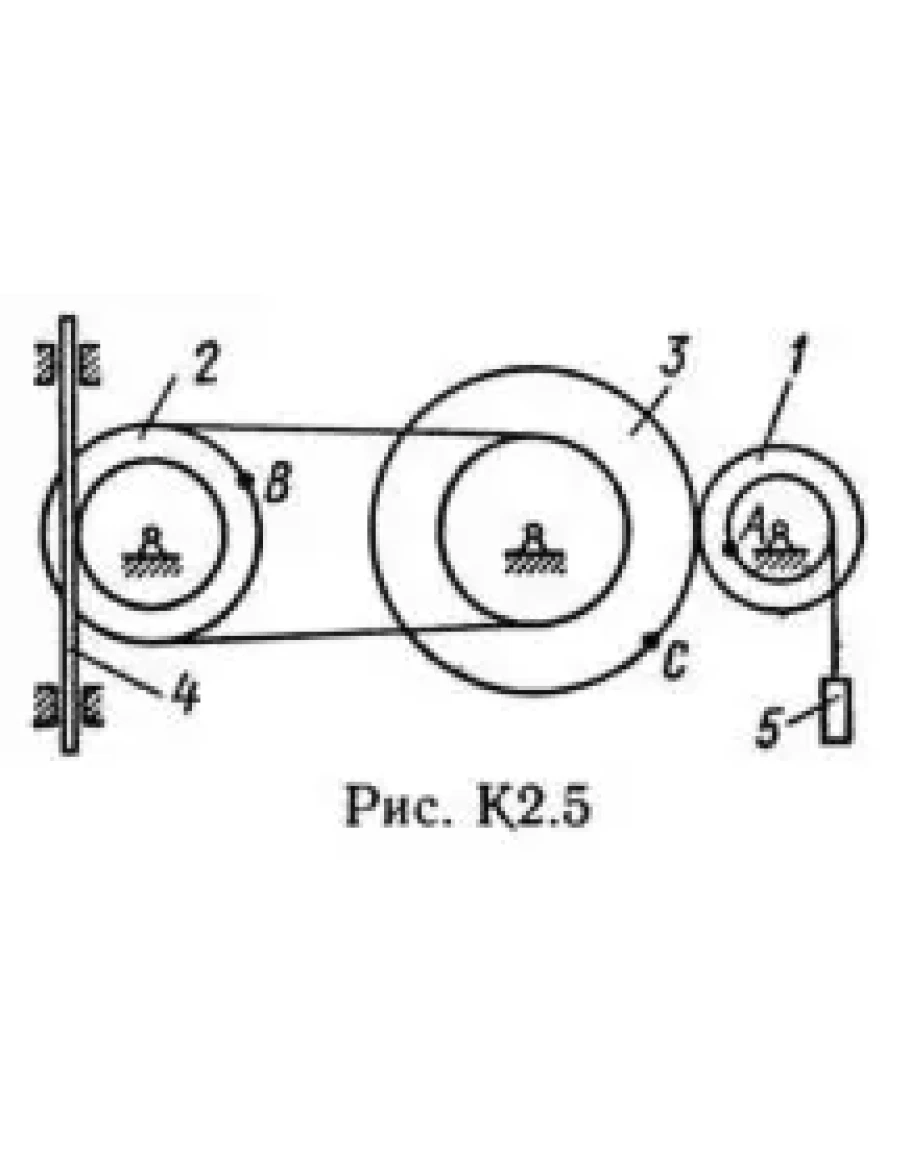 Механизм состоит из ступенчатых колес 1—3, находящихся в зацеплении или связанных ременной передачей, зубчатой рейки 4 и груза 5, привязанного к концу нити, намотанной на одно из колес (рис. К2.0 — К2.9, табл. К2). Радиусы ступеней колес равны соответственно: у колеса 1 – r1 = 2 см, R1 = 4 см, у колеса 2 – r2 = 6 см, R2 = 8 см, у колеса 3 – r3 — 12 см, R3 = 16 см. На ободьях колес расположены точки A, В и С.