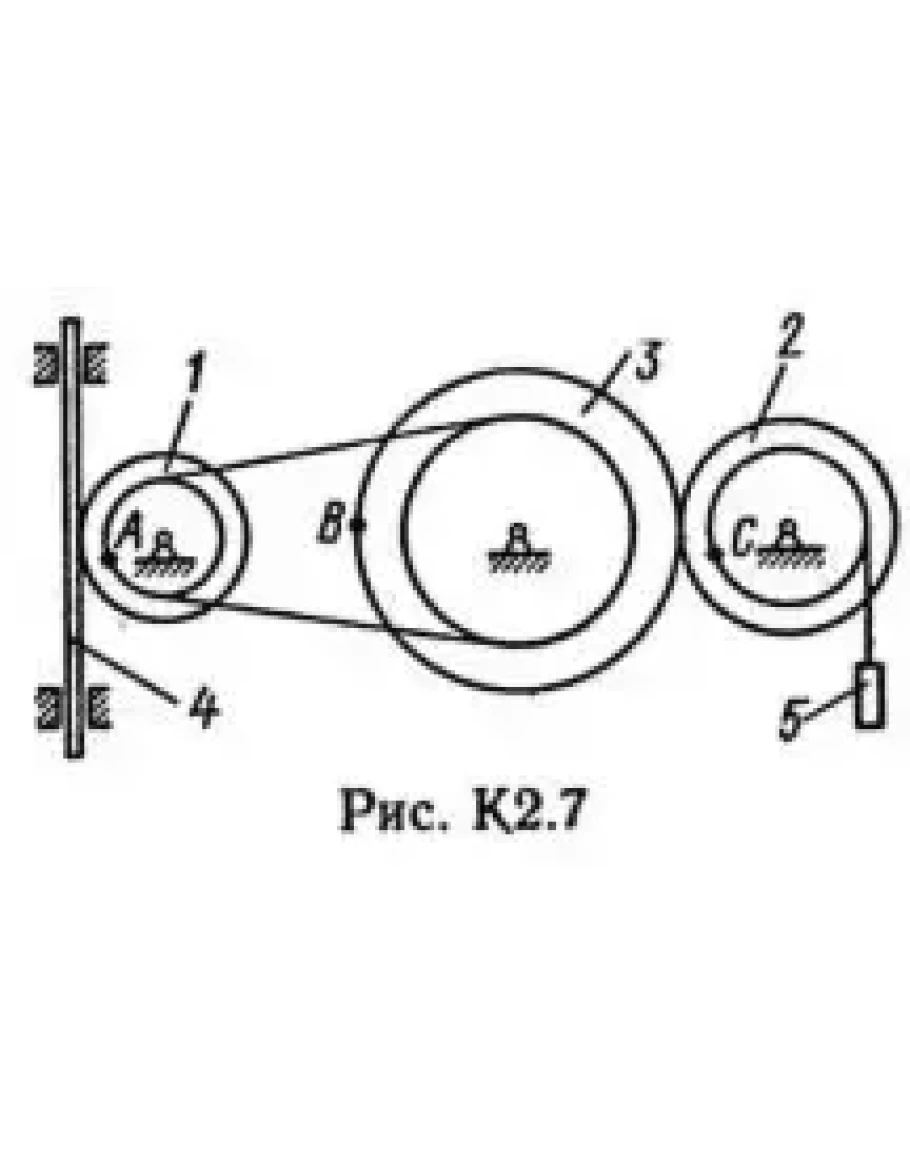 Механизм состоит из ступенчатых колес 1—3, находящихся в зацеплении или связанных ременной передачей, зубчатой рейки 4 и груза 5, привязанного к концу нити, намотанной на одно из колес (рис. К2.0 — К2.9, табл. К2). Радиусы ступеней колес равны соответственно: у колеса 1 – r1 = 2 см, R1 = 4 см, у колеса 2 – r2 = 6 см, R2 = 8 см, у колеса 3 – r3 — 12 см, R3 = 16 см. На ободьях колес расположены точки A, В и С.
