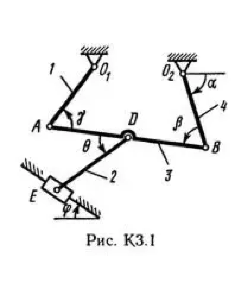 Плоский механизм состоит из стержней 1, 2, 3, 4 и ползуна В или Е (рис. КЗ.0 — К3.7) или из стержней 1, 2, 3 и ползунов В и E (рис. К3.8, К3.9), соединенных друг с другом и с неподвижными опорами O1, O2 шарнирами; точка D находится в середине стержня АВ. Длины стержней равны соответственно l1 = 0,4 м, l2 = 1,2 м, l3 = 1,4 м, l4 = 0,6 м. Положение механизма определяется углами α, β, γ, φ, θ. Значения этих углов и других заданных величин указаны в табл. КЗа (для рис. 0—4) или в табл. КЗб (для рис. 5—9); при этом в табл. КЗа ω1 и ω4 — величины постоянные.