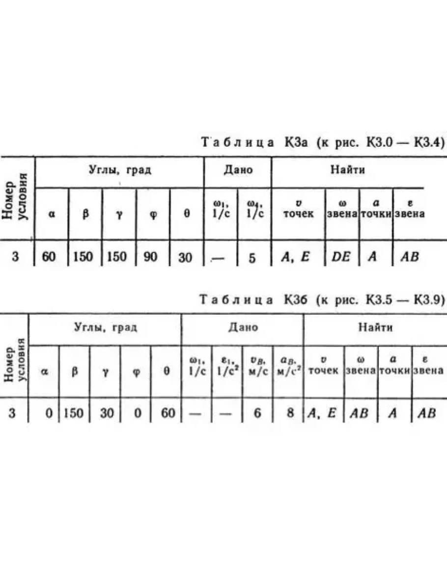 Плоский механизм состоит из стержней 1, 2, 3, 4 и ползуна В или Е (рис. КЗ.0 — К3.7) или из стержней 1, 2, 3 и ползунов В и E (рис. К3.8, К3.9), соединенных друг с другом и с неподвижными опорами O1, O2 шарнирами; точка D находится в середине стержня АВ. Длины стержней равны соответственно l1 = 0,4 м, l2 = 1,2 м, l3 = 1,4 м, l4 = 0,6 м. Положение механизма определяется углами α, β, γ, φ, θ. Значения этих углов и других заданных величин указаны в табл. КЗа (для рис. 0—4) или в табл. КЗб (для рис. 5—9); при этом в табл. КЗа ω1 и ω4 — величины постоянные.
