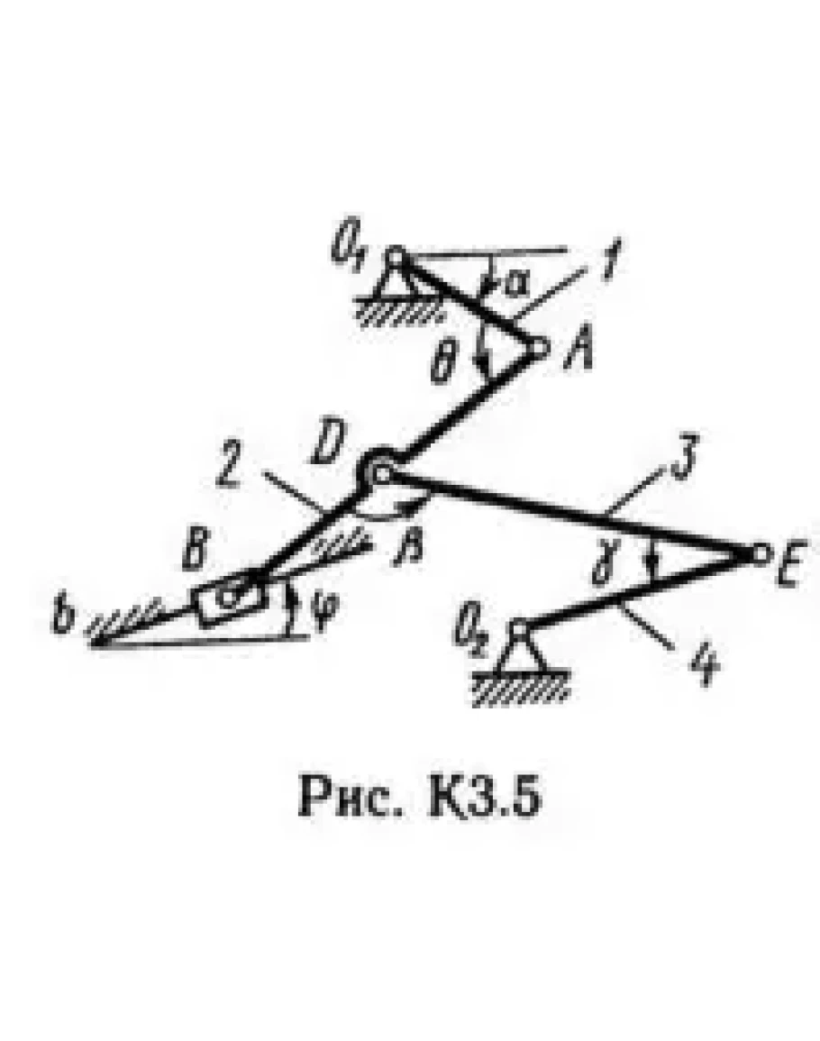 Плоский механизм состоит из стержней 1, 2, 3, 4 и ползуна В или Е (рис. КЗ.0 — К3.7) или из стержней 1, 2, 3 и ползунов В и E (рис. К3.8, К3.9), соединенных друг с другом и с неподвижными опорами O1, O2 шарнирами; точка D находится в середине стержня АВ. Длины стержней равны соответственно l1 = 0,4 м, l2 = 1,2 м, l3 = 1,4 м, l4 = 0,6 м. Положение механизма определяется углами α, β, γ, φ, θ. Значения этих углов и других заданных величин указаны в табл. КЗа (для рис. 0—4) или в табл. КЗб (для рис. 5—9); при этом в табл. КЗа ω1 и ω4 — величины постоянные.