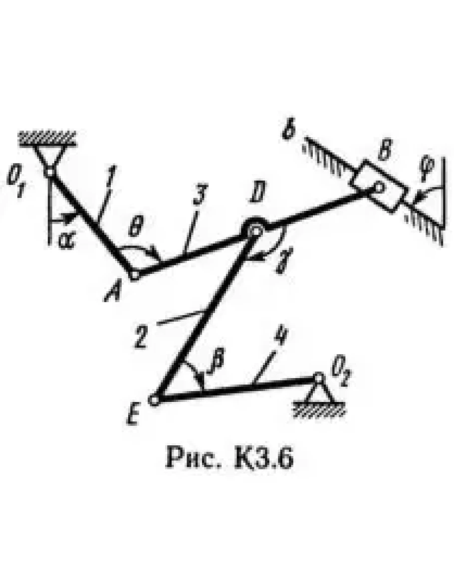 Плоский механизм состоит из стержней 1, 2, 3, 4 и ползуна В или Е (рис. КЗ.0 — К3.7) или из стержней 1, 2, 3 и ползунов В и E (рис. К3.8, К3.9), соединенных друг с другом и с неподвижными опорами O1, O2 шарнирами; точка D находится в середине стержня АВ. Длины стержней равны соответственно l1 = 0,4 м, l2 = 1,2 м, l3 = 1,4 м, l4 = 0,6 м. Положение механизма определяется углами α, β, γ, φ, θ. Значения этих углов и других заданных величин указаны в табл. КЗа (для рис. 0—4) или в табл. КЗб (для рис. 5—9); при этом в табл. КЗа ω1 и ω4 — величины постоянные.