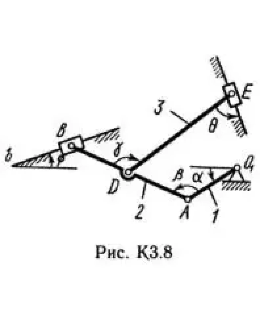 Плоский механизм состоит из стержней 1, 2, 3, 4 и ползуна В или Е (рис. КЗ.0 — К3.7) или из стержней 1, 2, 3 и ползунов В и E (рис. К3.8, К3.9), соединенных друг с другом и с неподвижными опорами O1, O2 шарнирами; точка D находится в середине стержня АВ. Длины стержней равны соответственно l1 = 0,4 м, l2 = 1,2 м, l3 = 1,4 м, l4 = 0,6 м. Положение механизма определяется углами α, β, γ, φ, θ. Значения этих углов и других заданных величин указаны в табл. КЗа (для рис. 0—4) или в табл. КЗб (для рис. 5—9); при этом в табл. КЗа ω1 и ω4 — величины постоянные.