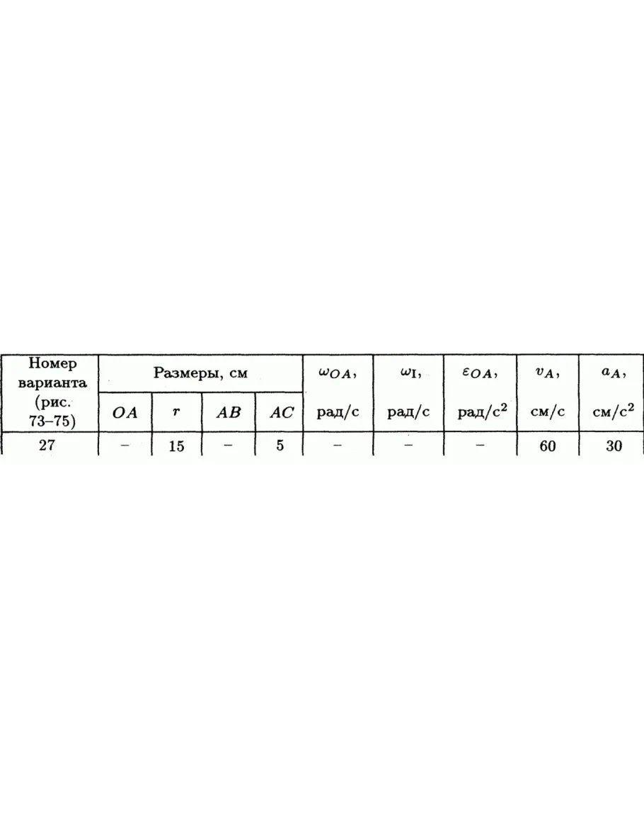 Решение задачи К5 Вариант 27 из решебника по теоретической механике Яблонский А.А. 1978 г., на тему: К5 Определение скоростей и ускорении точек твердого тела при плоском движении (стр. 99).