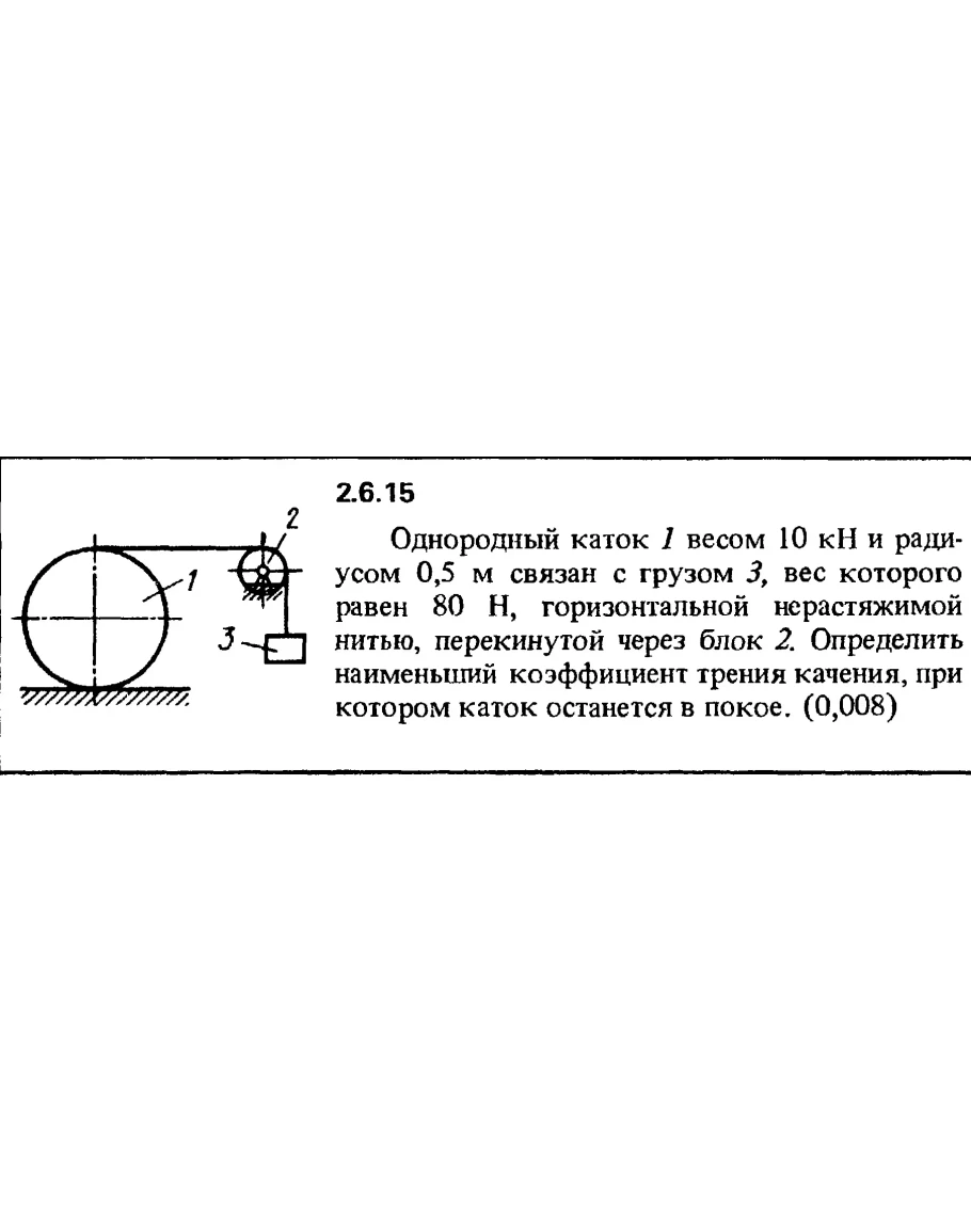 Однородный каток 1 весом 10 кН и радиусом 0,5 м связан с грузом 3, вес которого равен 80 Н, горизонтальной нерастяжимой нитью, перекинутой через блок 2. Определить наименьший коэффициент трения качения, при котором каток останется в покое.
