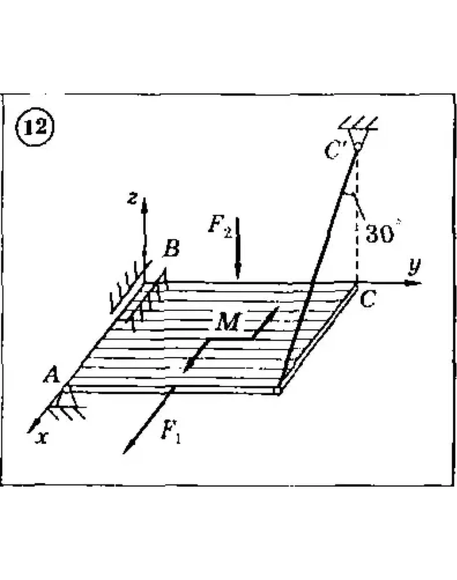 Для представленных на схемах 1-30 тел определить реакции опор. Тело представляет собой однородную прямоугольную плиту весом G = 12 кН, имеющую размеры |АВ| = 6 м и |ВС| = 2 м. Плита закреплена с помощью трех опор: шарнирно-неподвижной опоры (сферический шарнир) в точке А, подшибниковой опоры в точке В и опорного стержня в точке С. На плиту действует: пара сил с моментом М = 10 кН*м, и в серединах соответствующих сторон - горизонтальная сила F1 = 6 кН и вертикальная сила F2 = 8 кН.