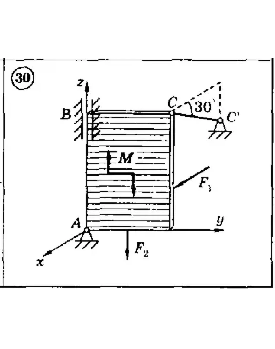 Для представленных на схемах 1-30 тел определить реакции опор. Тело представляет собой однородную прямоугольную плиту весом G = 12 кН, имеющую размеры |АВ| = 6 м и |ВС| = 2 м. Плита закреплена с помощью трех опор: шарнирно-неподвижной опоры (сферический шарнир) в точке А, подшибниковой опоры в точке В и опорного стержня в точке С. На плиту действует: пара сил с моментом М = 10 кН*м, и в серединах соответствующих сторон - горизонтальная сила F1 = 6 кН и вертикальная сила F2 = 8 кН.