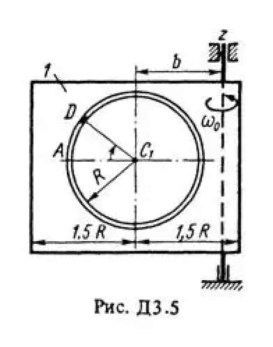 Плита (рис Д3.5-Д3.9) имеет в момент времени t0 = 0 угловую скорость ω0 = 8 с-1, и в этот момент на нее начинает действовать вращательный момент М (момент относительно оси), заданный в таблице в ньютонометрах и направленный как ω0 при М > 0 и в противоположную сторону при М < 0. Ось z проходит от центра C1 плиты на расстоянии b; размеры плиты показаны на рисунках.