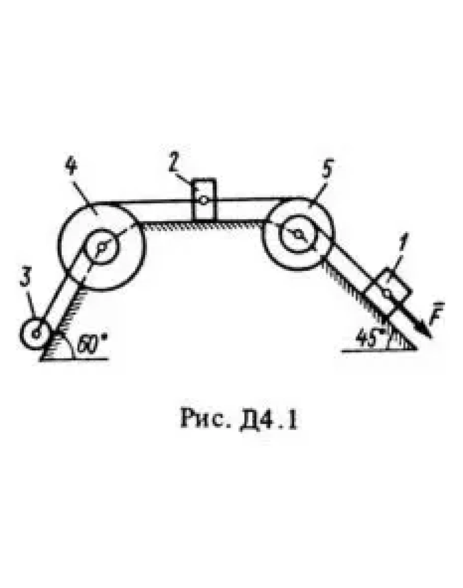 Механическая система состоит из грузов 1 и 2 (коэффициент трения грузов о плоскость f = 0,1), цилиндрического сплошного однородного катка 3 и ступенчатых шкивов 4 и 5 с радиусами ступеней R4 = 0,3 м, r4 = 0,1 м, R5 = 0,2 м, r5 = 0,1 м (массу каждого шкива считать равномерно распределенной по его внешнему ободу) (рис. Д4.0-Д4.9, табл. Д4). Тела системы соединены друг с другом нитями, намотанными на шкивы; участки нитей параллельны соответствующим плоскостям.