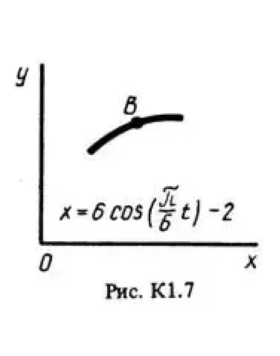 Точка B движется в плоскости xy (рис. К1.0-К1.9, табл. К1; траектория точки на рисунках показана условно). Закон движения точки задан уравнениями: x = f1(t), y = f2(t), где x и y выражены в сантиметрах, t – в секундах.