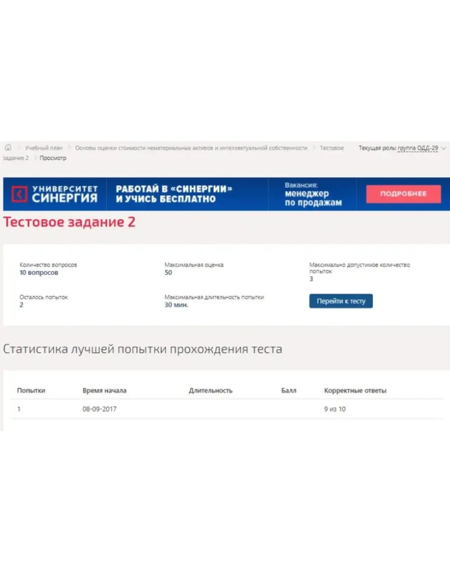 Основы оценки стоимости нематериальных активов и интеллектуальной собственности.Тест Синергия (Тестовое задание 2)