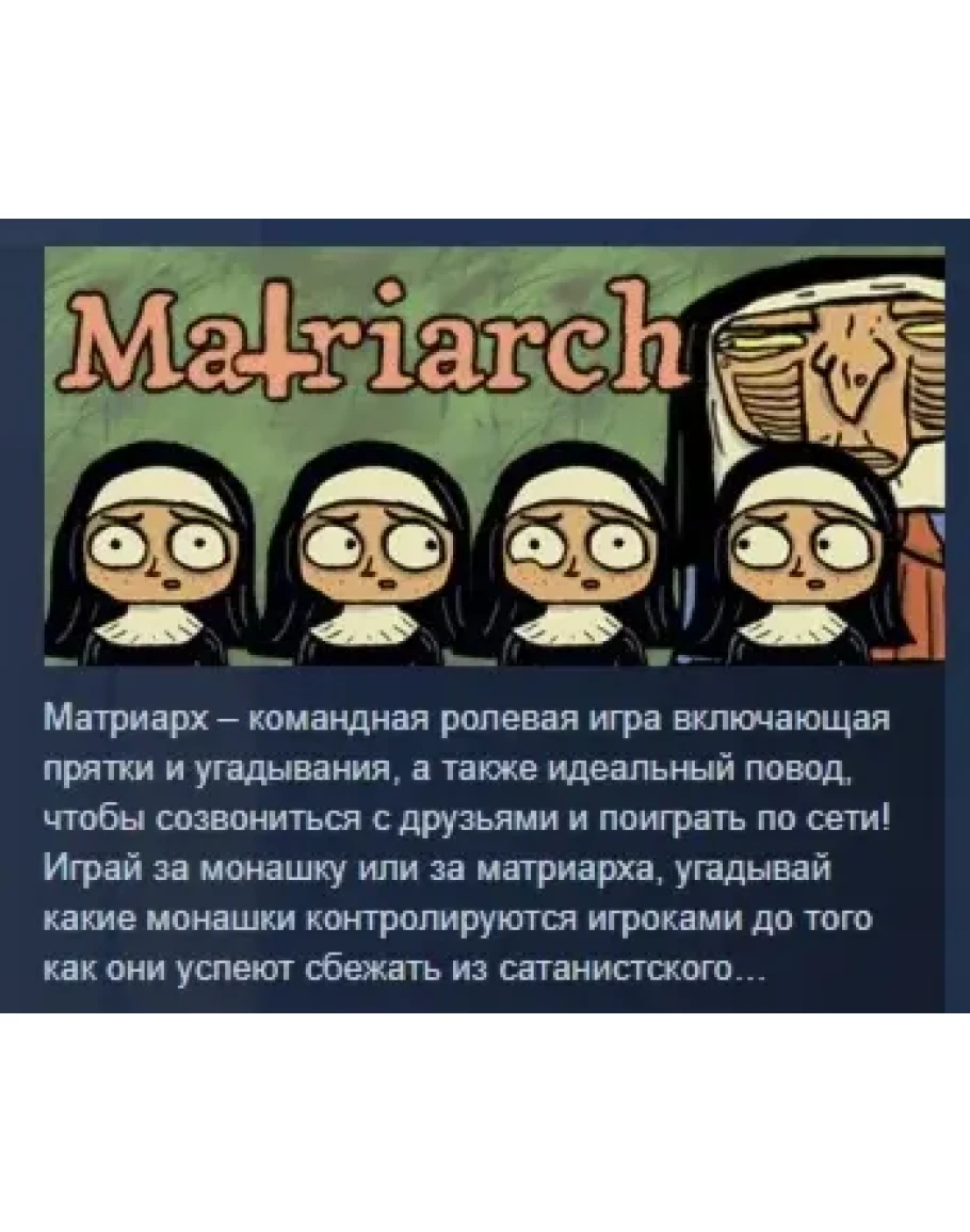 Матриарх – командная ролевая игра включающая прятки и угадывания, а также идеальный повод, чтобы созвониться с друзьями и поиграть по сети! Играй за монашку или за матриарха, угадывай какие монашки контролируются игроками до того как они успеют сбежать из сатанистского монастыря!