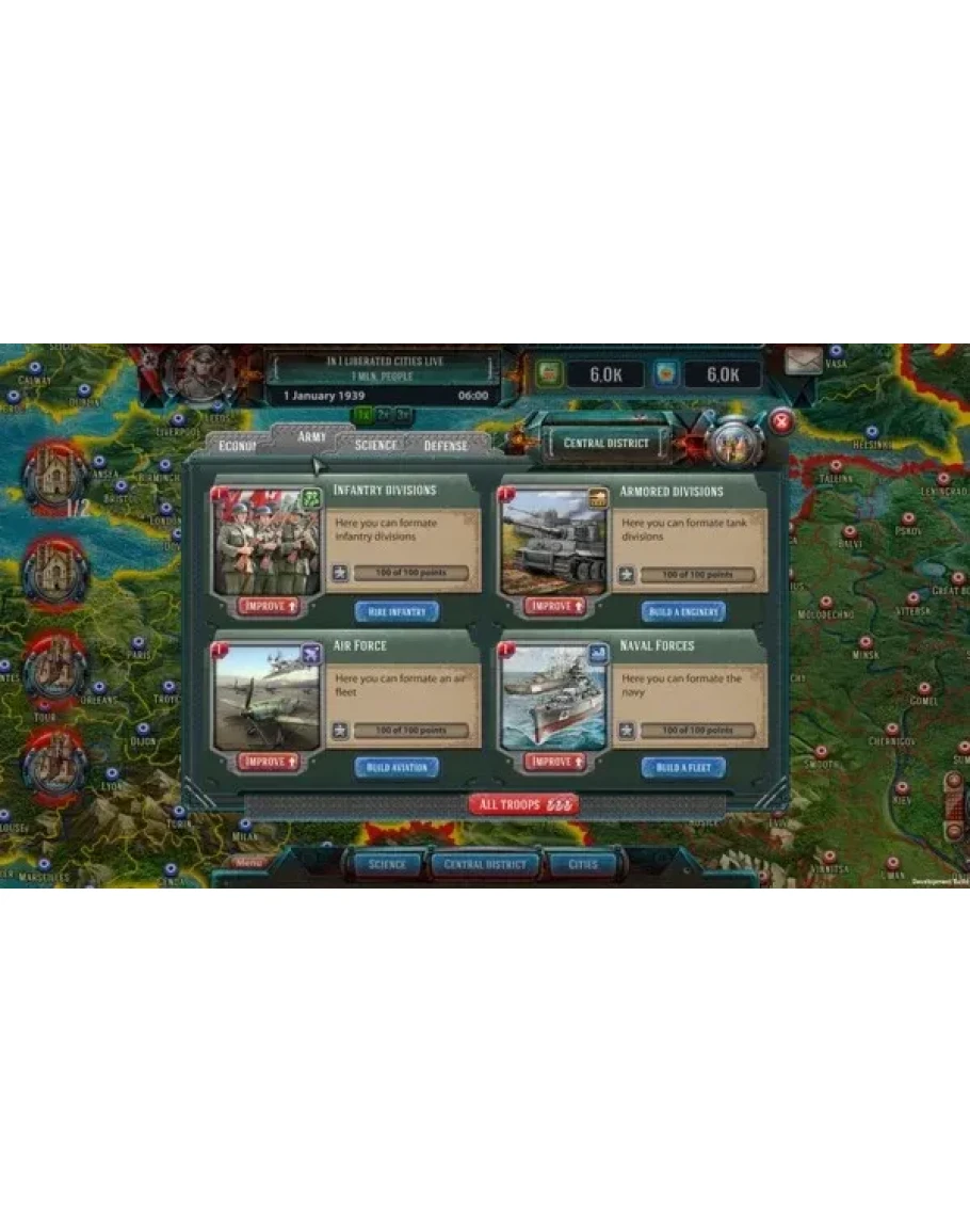 Выбирайте из трёх наций - СССР, Германия и Союзники - и проложите свой путь за каждую из них. Вы сами создаёте свою армию! Открывайте новые и новые возможности, управляйте не только пехотой и танками, но и постройкой флота военных кораблей, руководите созданием истребителей и многое другое! Не забывайте о защите своих городов - решайте сами, где вырыть окоп и установить противотанковые ежи. Выберите сами, какой город будет неприступной крепостью для ваших врагов и куда вы выманите противника. Вы полностью контролируете бой, и только вам решать, как именно распоряжаться своими войсками.