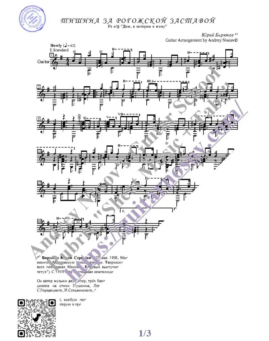 Кликните "Подробнее" для получения дополнительной информацииВашему вниманию предлагается композиция "Тишина за Рогожской заставой (Ю.Бирюков)", предназначенная для исполнения на 6-ти струнной гитаре СОЛО. Запись выполнена нотами, сопровождена подробнейшей аппликатурой и продублирована табулатурой.
