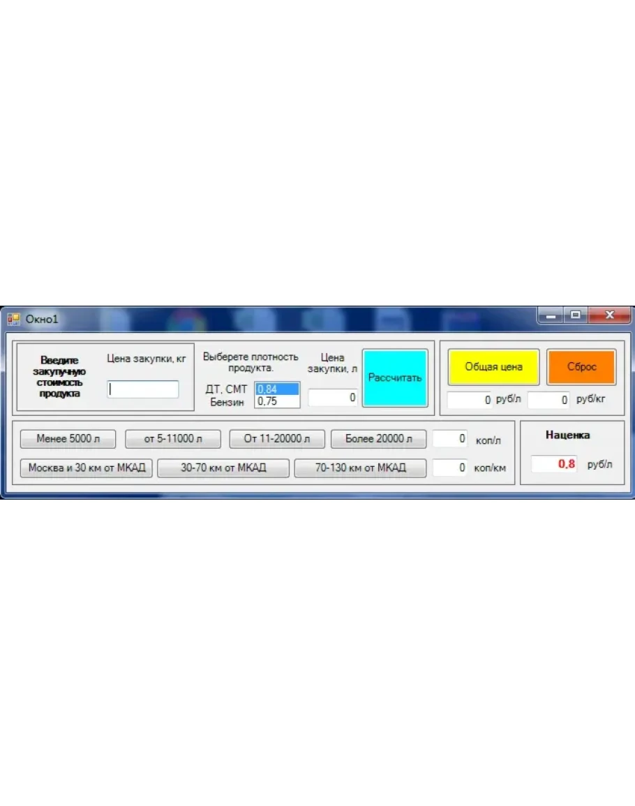 Программа для расчета стоимости топлива. Учитываются такие параметры как: закупочная цена в литрах или кг., объем поставляемого нефтепродукта, дистанция доставки, наценка (прибыль продавца). Программа создана для региона Москвы и Московской области, но реально нет разницы так как цены по дистанции и километражу практически схожи во всех регионах России. Параметры которые можно вводить: цена закупки, плотность продукта, дистанция, объем, наценка.