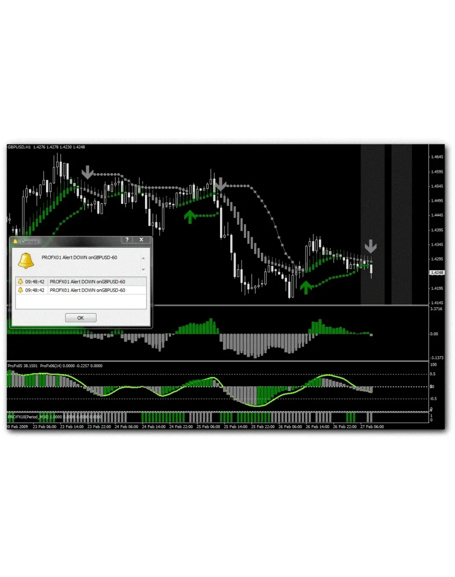 Торговая система Pro Fx состоит из 9 индикаторов, среди которых трендовые, осцилляторы, подающий команды на вход и звуковой. аллерт
