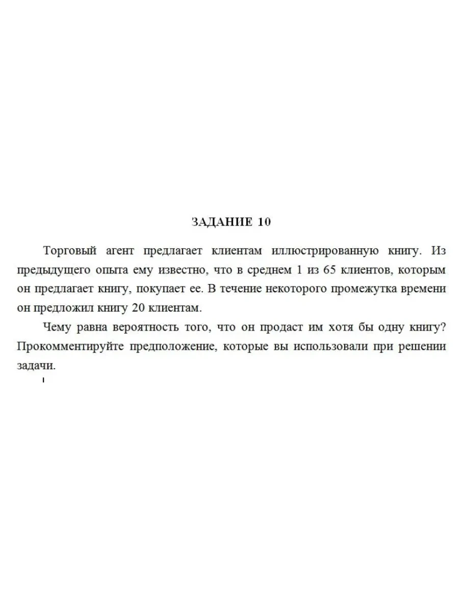Торговый агент предлагает клиентам иллюстрированную книгу. Из предыдущего опыта ему известно, что в среднем 1 из 65 клиентов, которым он предлагает книгу, покупает ее. В течение некоторого промежутка времени он предложил книгу 20 клиентам.
