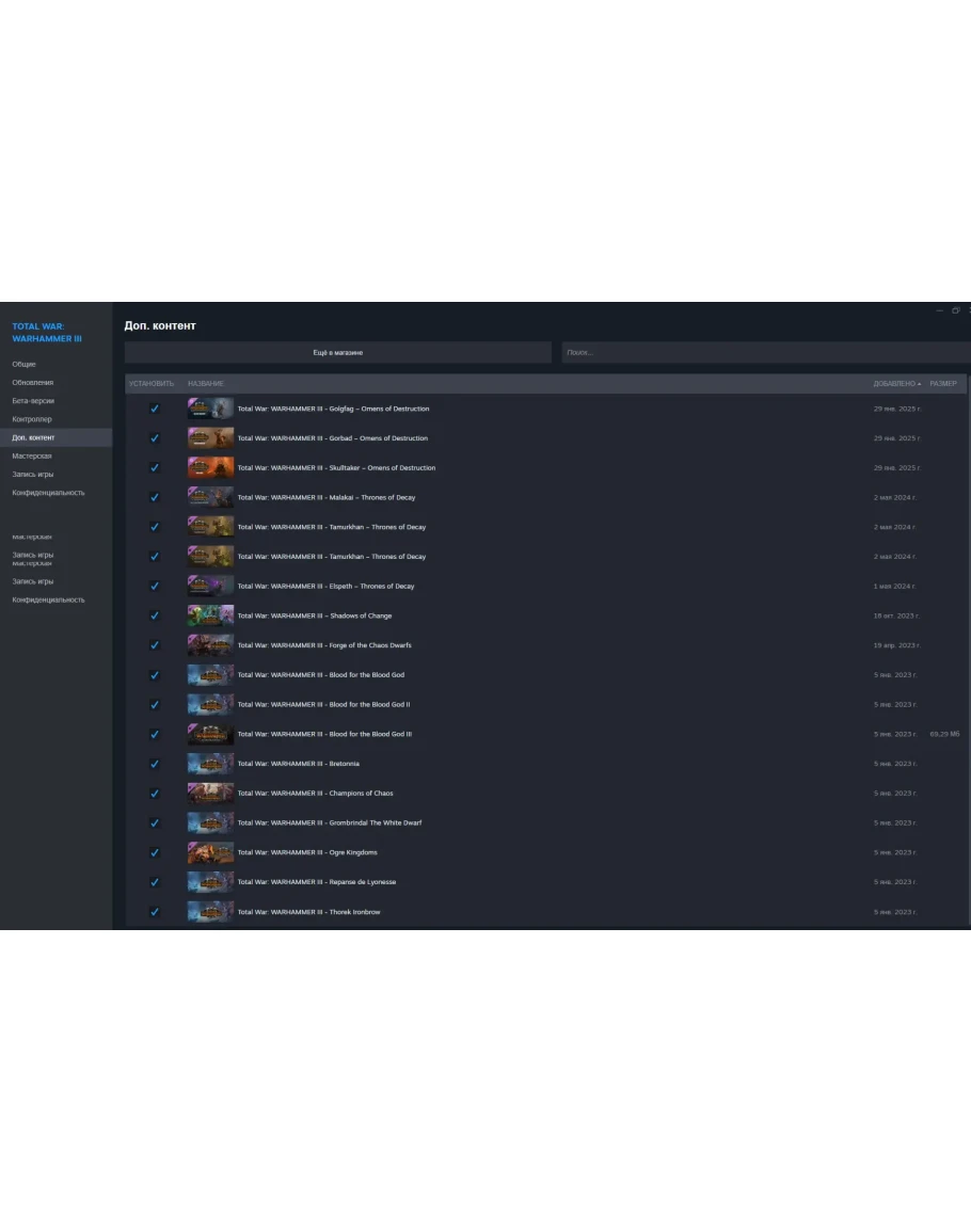 На аккаунте отсутствует Total War: WARHAMMER I и Total War: WARHAMMER II. Расы и дополнительный контент первых двух частей в игре работать не будут.