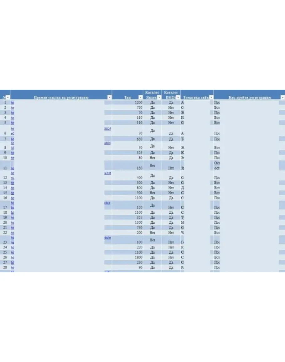 База собиралась полностью вручную, не паблик. Количество копий ограничено. Структура удобная, к каждому сайту указана тематика и наличие к каталогах. Все ссылки на регистрацию прямые. Указано как пройти регистрацию.