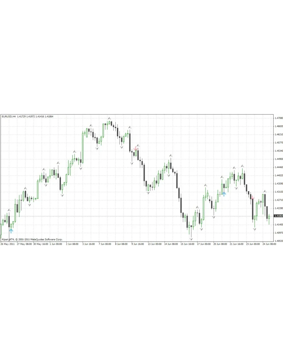 Сигналы на покупку/продажу возникают при их пересечении и выводятся ввиде стрелок - Вверх (Покупка) / Вниз (Продажа).