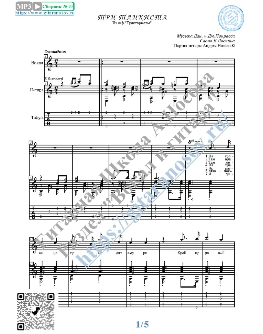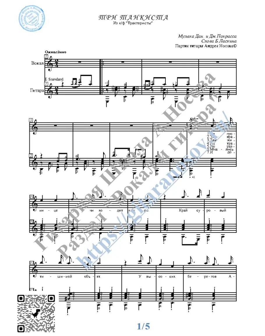 Кликните "Подробнее" для получения дополнительной информацииВашему вниманию предлагается композиция "Три танкиста (муз.Дан. и Дм.Покрасса, сл.Б.Ласкина)", предназначенная для вокала в сопровождении 6-ти струнной гитары. Запись выполнена нотами и включает в себя партию вокала с подтекстовкой, партию гитары с подробнейшей аппликатурой и текст песни (НА РУССКОМ).