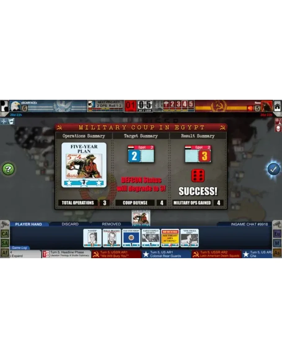 Twilight Struggle is a two-player game where players play as either the US or USSR during the Cold War. Using actual events from history, players must plan out their strategies in order to obtain world dominance. Play Twilight Struggle and change the course of history.