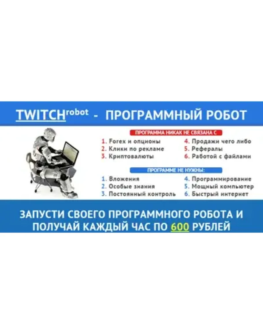 Робот никому ничего не продает, не предлагает стать его рефералом в каком-то сомнительном проекте и уж тем более не занимается попрошайничеством или обманом.