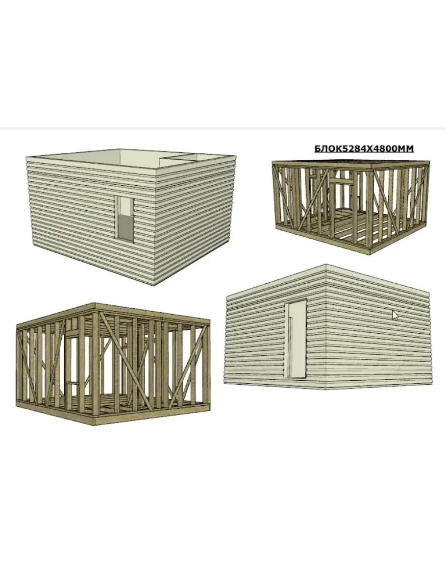 Данный каркасный блок-модуль имеет максимальную длину 5284х4800 мм (для транспортировки) имеется туалет и душевая, а также большая студия спальня + кухонная зона, можно собрать мансарду 2-й этаж площадью 12 кв.м.