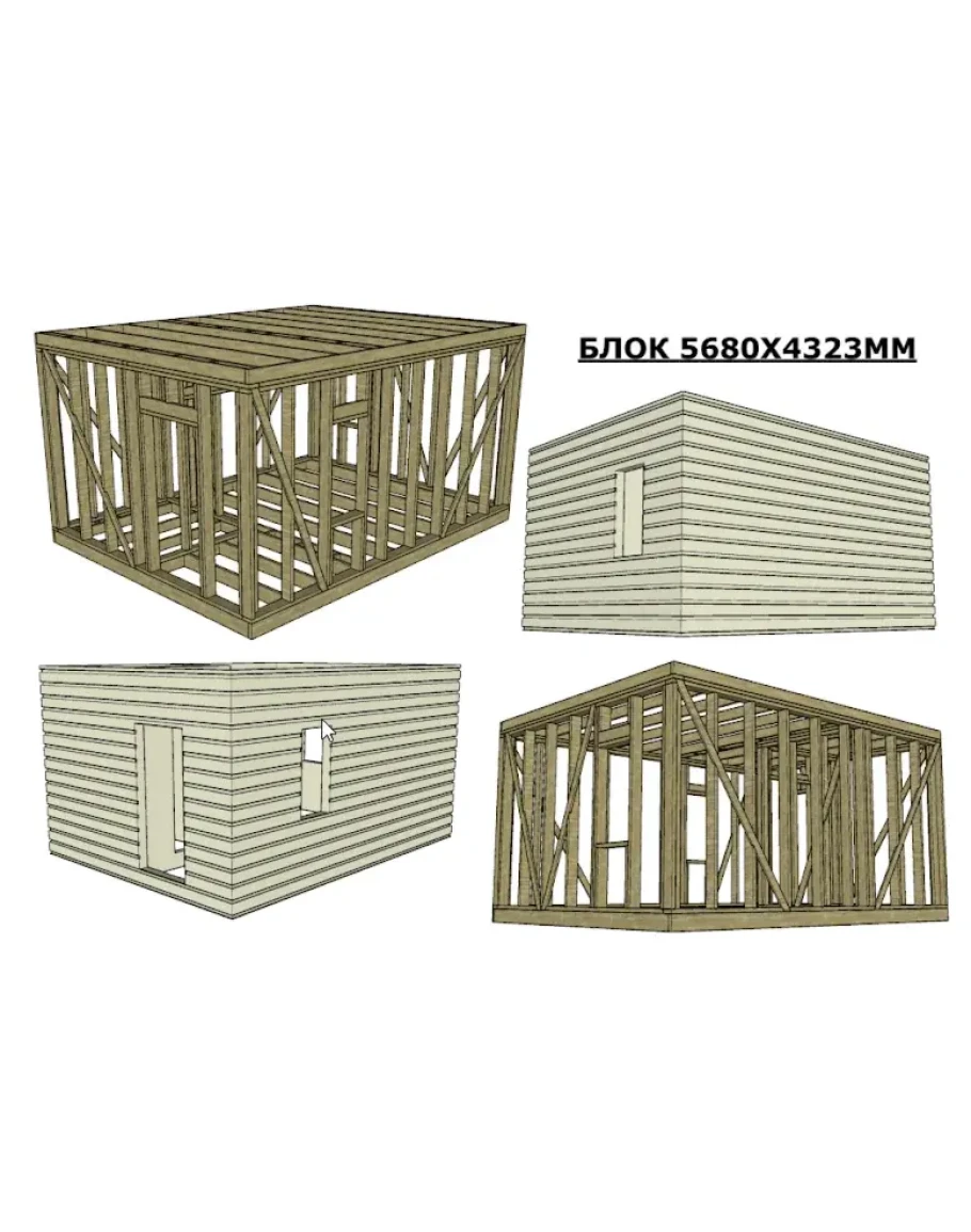 Данный каркасный блок-модуль имеет максимальную длину 5680х4323 мм (для транспортировки) и на ней можно собрать 2-й этаж площадью 14 кв.м.