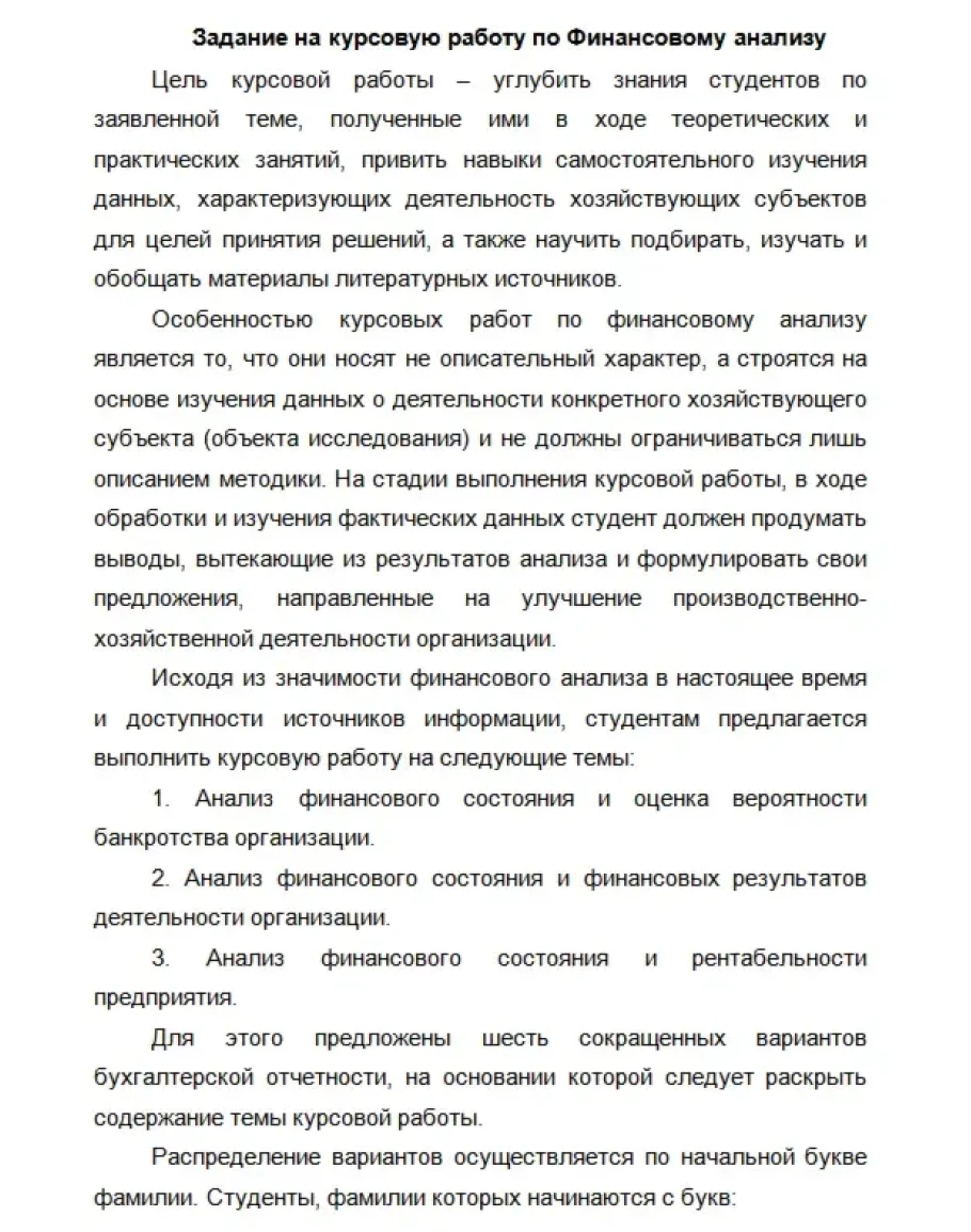 Исходя из значимости финансового анализа в настоящее время и доступности источников информации, студентам предлагается выполнить курсовую работу на следующие темы: