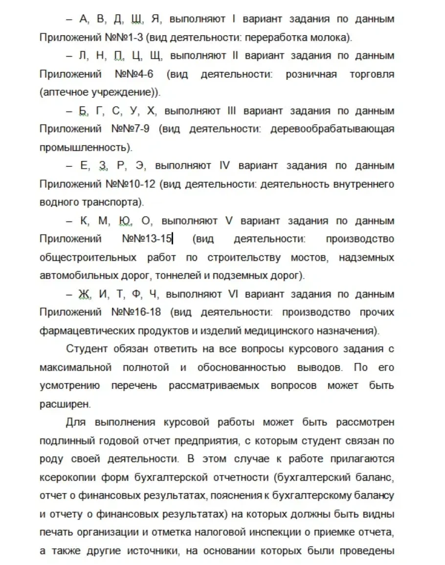 – А, В, Д, Ш, Я, выполняют I вариант задания по данным Приложений №№1-3 (вид деятельности: переработка молока).