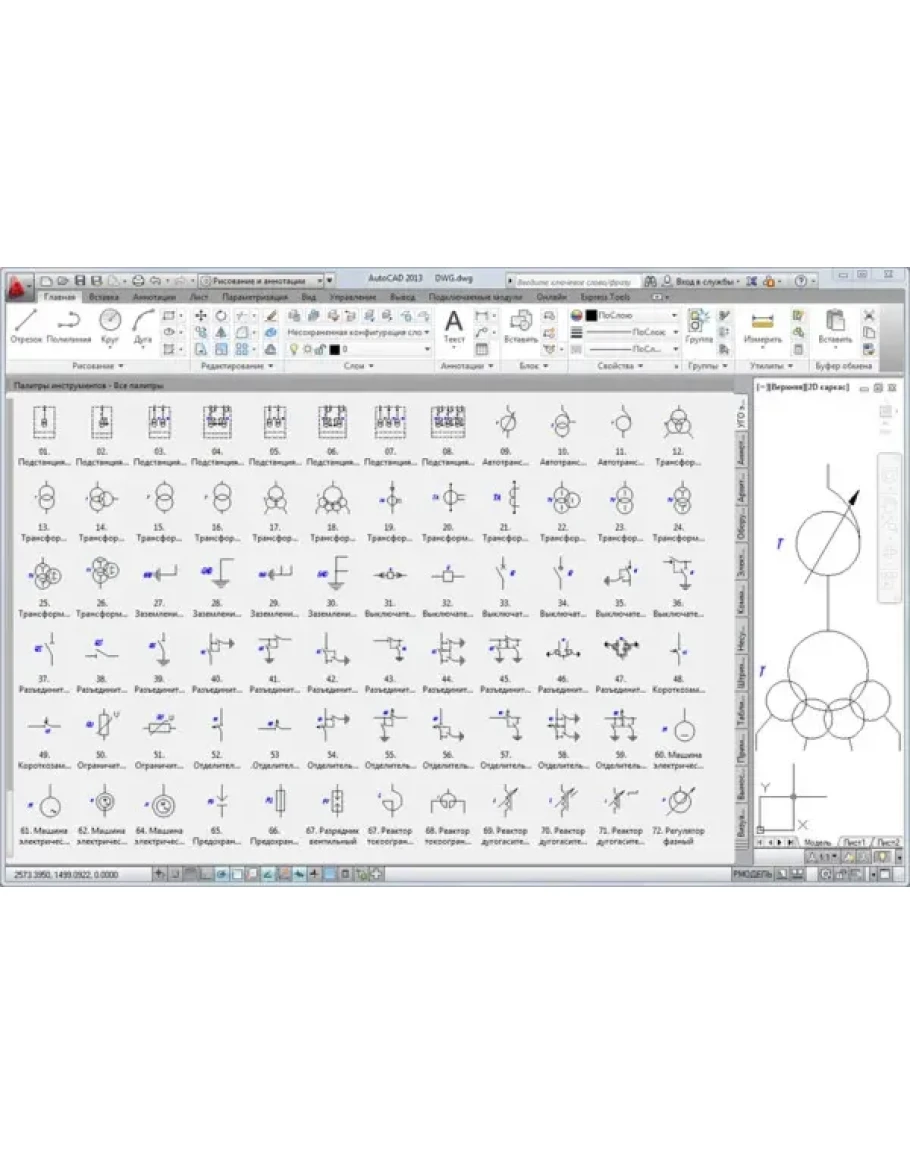 Коллекция содержит 73 условно-графических обозначения электротехнических устройств в формате AutoCAD DWG, применяемых при проектировании однолинейных схем главных электрических цепей.