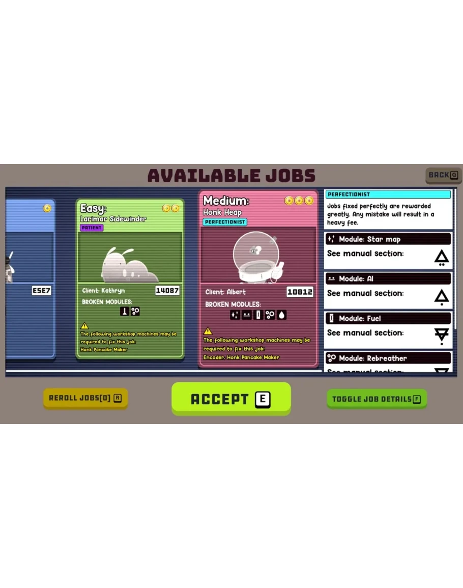 Разнообразные инструменты, диагностические приборы, запчасти и рабочие принадлежности помогут вам исправлять поломки в модулях процедурно-генерируемых космических кораблей. Приготовьтесь к самым разным задачам — от простой дозаправки до пересборки целых кораблей. Все они заставят вас хвататься то за один, то за другой инструмент, резать, затягивать и ослаблять винты, стараясь каждый день обслужить как можно больше кораблей за ограниченное время. Огромное разнообразие кораблей и модулей позволит вам быстро набить руку в самых необычных местах.