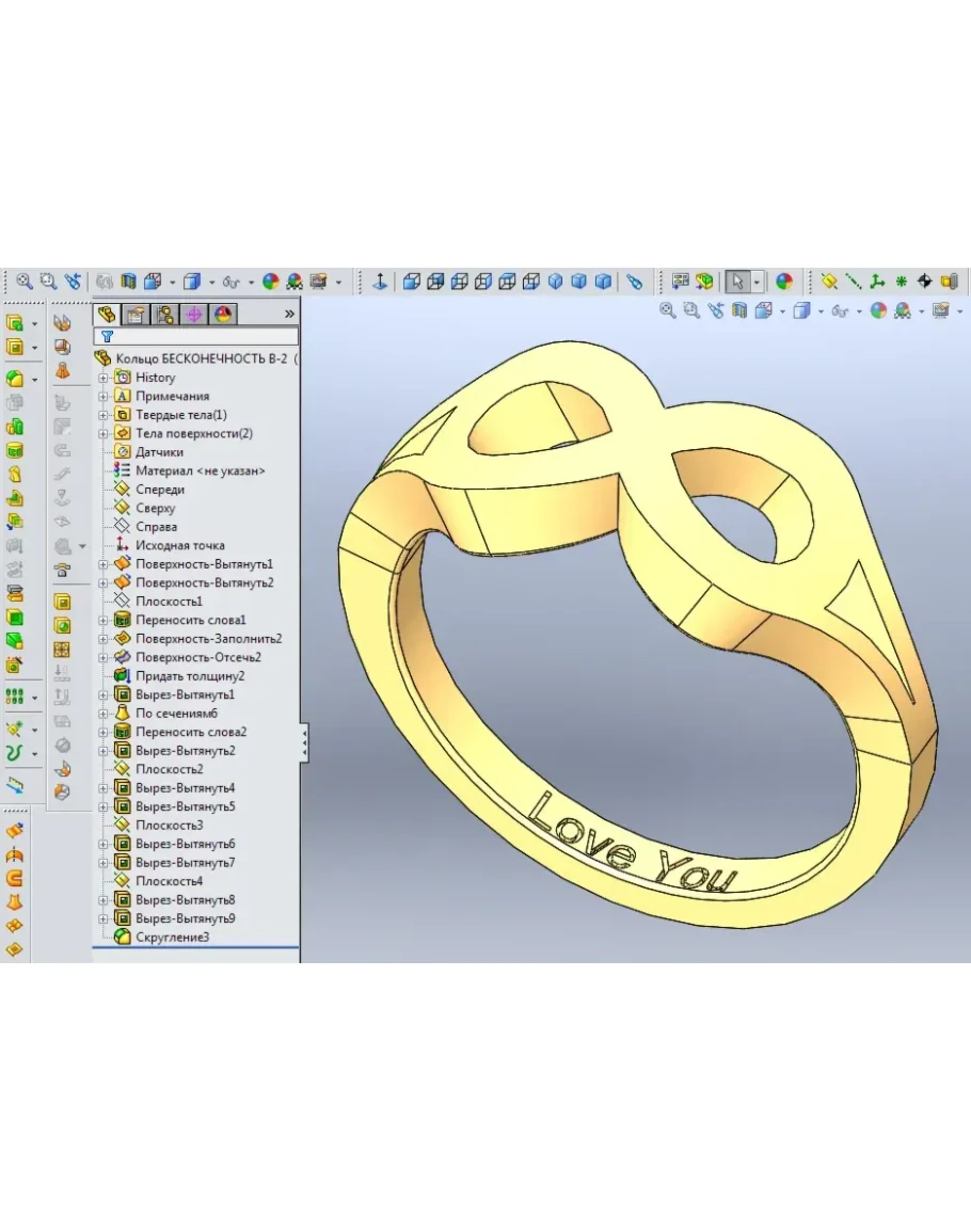 Продолжаем учится моделировать ювелирные изделия в программе SolidWorks. В предыдущем уроке мы научились моделировать печатку. Сегодня пришло время усложнить задачу и сделать что-то посложнее. В этом уроке мы будем моделировать 3D-модель сложного кольца, применяя самые разные хитрости и уловки. Знание этих особенностей будет полезно всем, независимо от профиля и навыков. И напоследок урока научимся добавлять надпись (гравировку) на внутреннюю поверхность кольца.