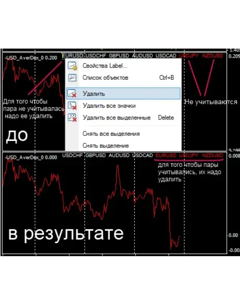 - настройка учитываемых валютных пар производится прямо на графике путем удаления надписей валютных пар (см. рис.)