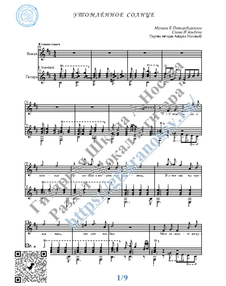 Кликните "Подробнее" для получения дополнительной информацииВашему вниманию предлагается композиция "Утомлённое солнце (муз.Е.Петерcбурского, сл.И.Альбека)", предназначенная для вокала в сопровождении 6-ти струнной гитары. Запись выполнена нотами и включает в себя партию вокала с подтекстовкой, партию гитары с подробнейшей аппликатурой и текст песни (НА РУССКОМ).