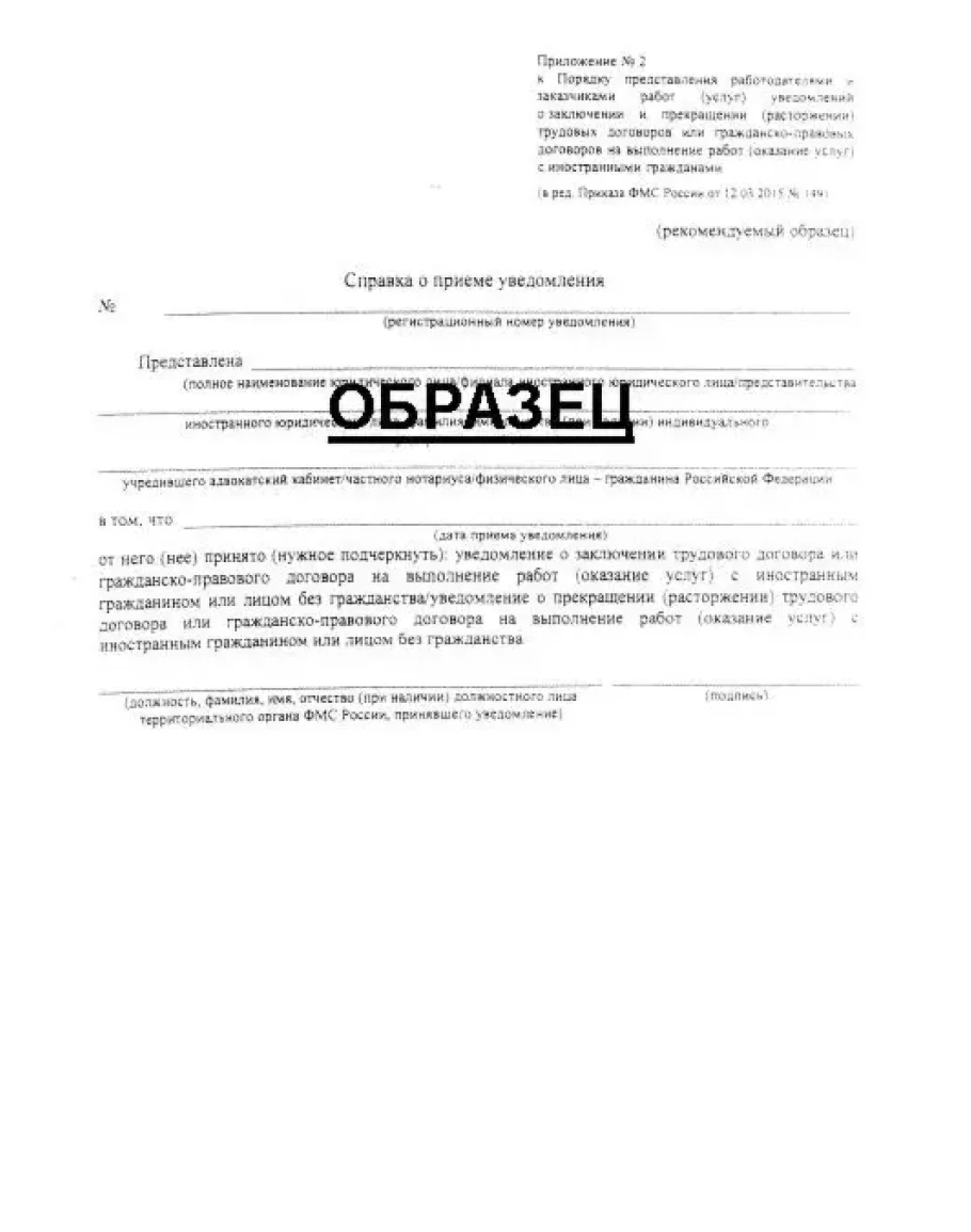 Форма уведомления о расторжении с иностранным гражданином трудового договора в соответствии с Приказом ФМС России от 12.03.2015 N 149 "О внесении изменений в Приказ ФМС России от 28 июня 2010 г. N 147 "О формах и порядке уведомления Федеральной миграционной службы об осуществлении иностранными гражданами трудовой деятельности на территории РФ"(в ред. Приказа ФМС России от 12.03.2015 № 149)