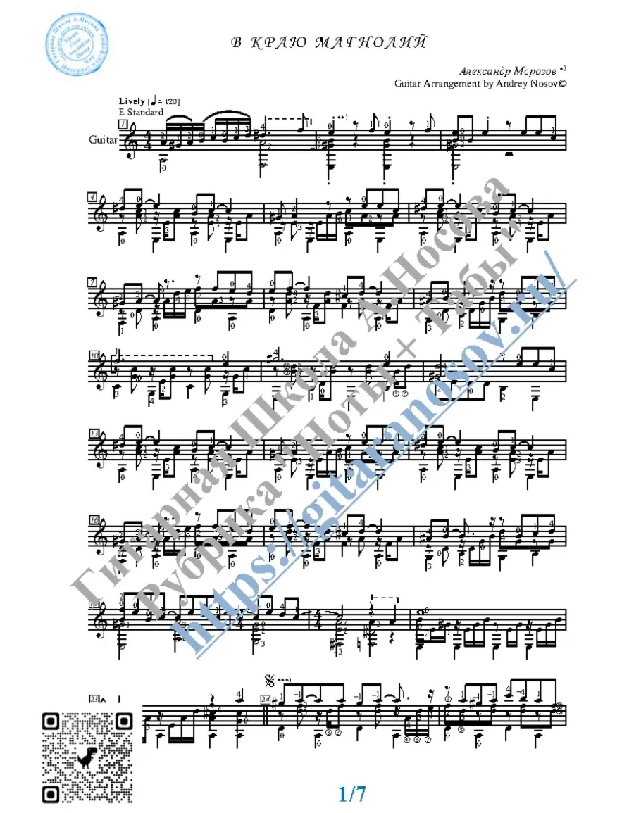 Кликните "Подробнее" для получения дополнительной информацииВашему вниманию предлагается популярная песня "В краю магнолий" (А.Морозов), предназначенная для исполнения на 6-ти струнной гитаре СОЛО. Запись выполнена нотами, сопровождена подробнейшей аппликатурой и продублирована табулатурой. И ещё…