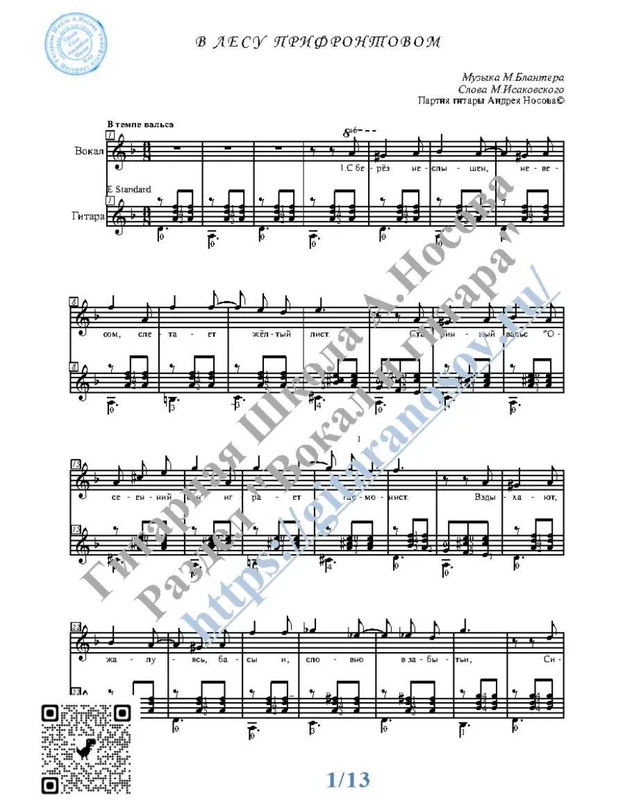 Кликните "Подробнее" для получения дополнительной информацииВашему вниманию предлагается композиция "В лесу прифронтовом (муз.М.Блантера, сл.М.Исаковского)", предназначенная для вокала в сопровождении 6-ти струнной гитары. Запись выполнена нотами и включает в себя партию вокала с подтекстовкой, партию гитары с подробнейшей аппликатурой и текст песни (НА РУССКОМ).