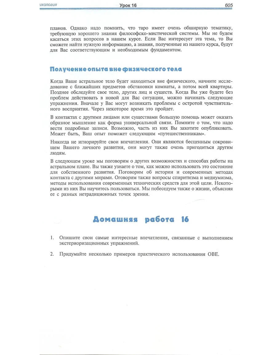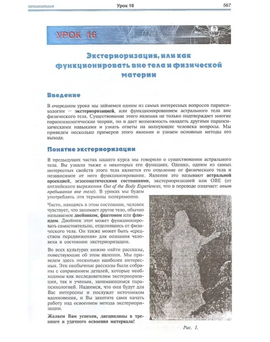 В очередном уроке мы займемся одним из самых интересных вопросов парапсихологии - экстериоризацией, или функционированием астрального тела вне физического тела. Существование этого явления не только подтверждает многие парапсихологические теории, но и дает возможность овладеть другими парапсихическими навыками и узнать ответы на волнующие человека вопросы. Мы приведем несколько примеров этого явления и узнаем основные методы его выхода.