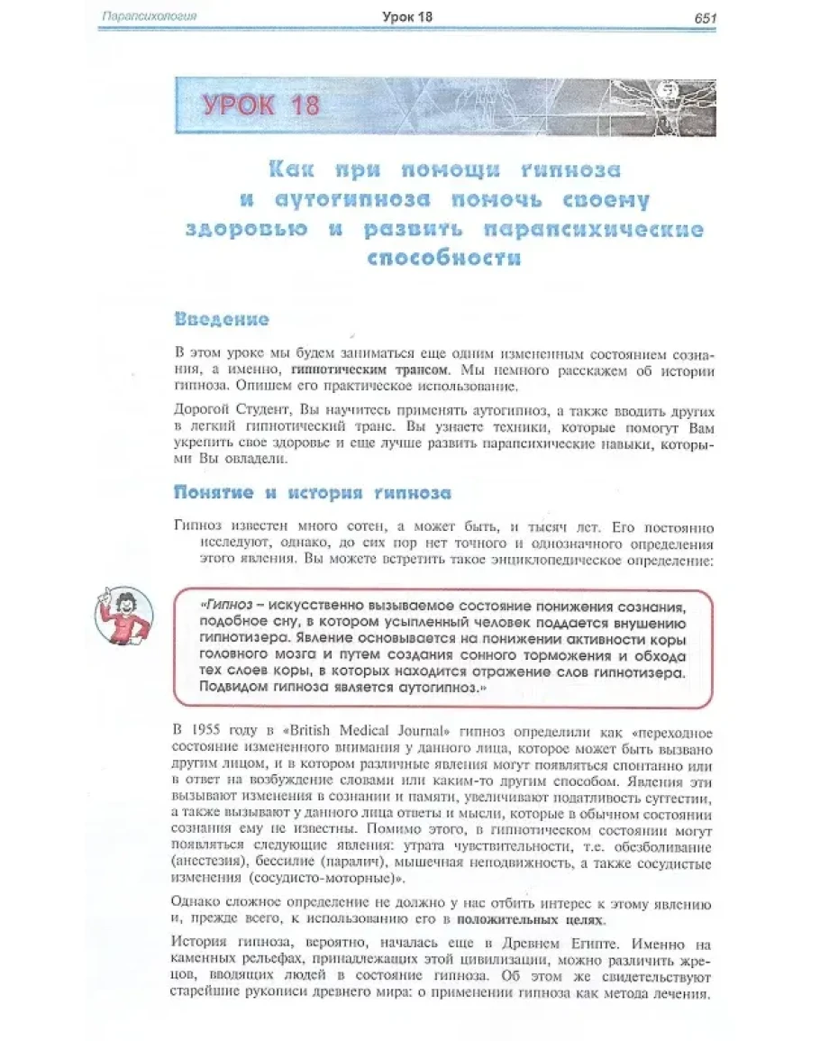 В этом уроке мы будем заниматься еще одним измененным состоянием сознания, а именно, гипнотическим трансом. Мы немного расскажем об истории гипноза. Опишем его практическое использование. Вы научитесь применять аутогипноз, а также вводить других в легкий гипнотический транс. Вы узнаете техники, которые помогут Вам укрепить свое здоровье и еще лучше развить парапсихические навыки, которыми Вы овладели.