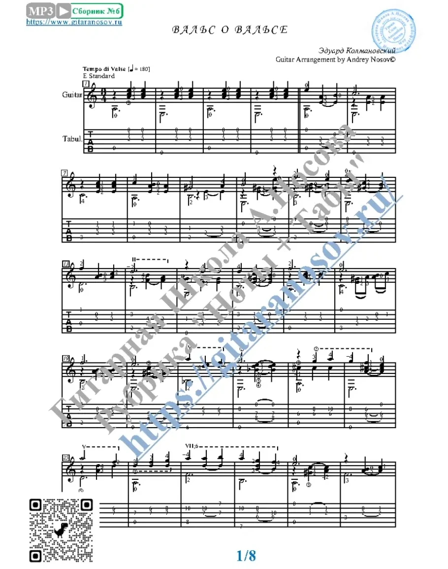 Товар включает в себя ноты с табулатурой и без табулатуры (в одном PDF). Прилагается ссылка на прослушивание / скачивание mp3.